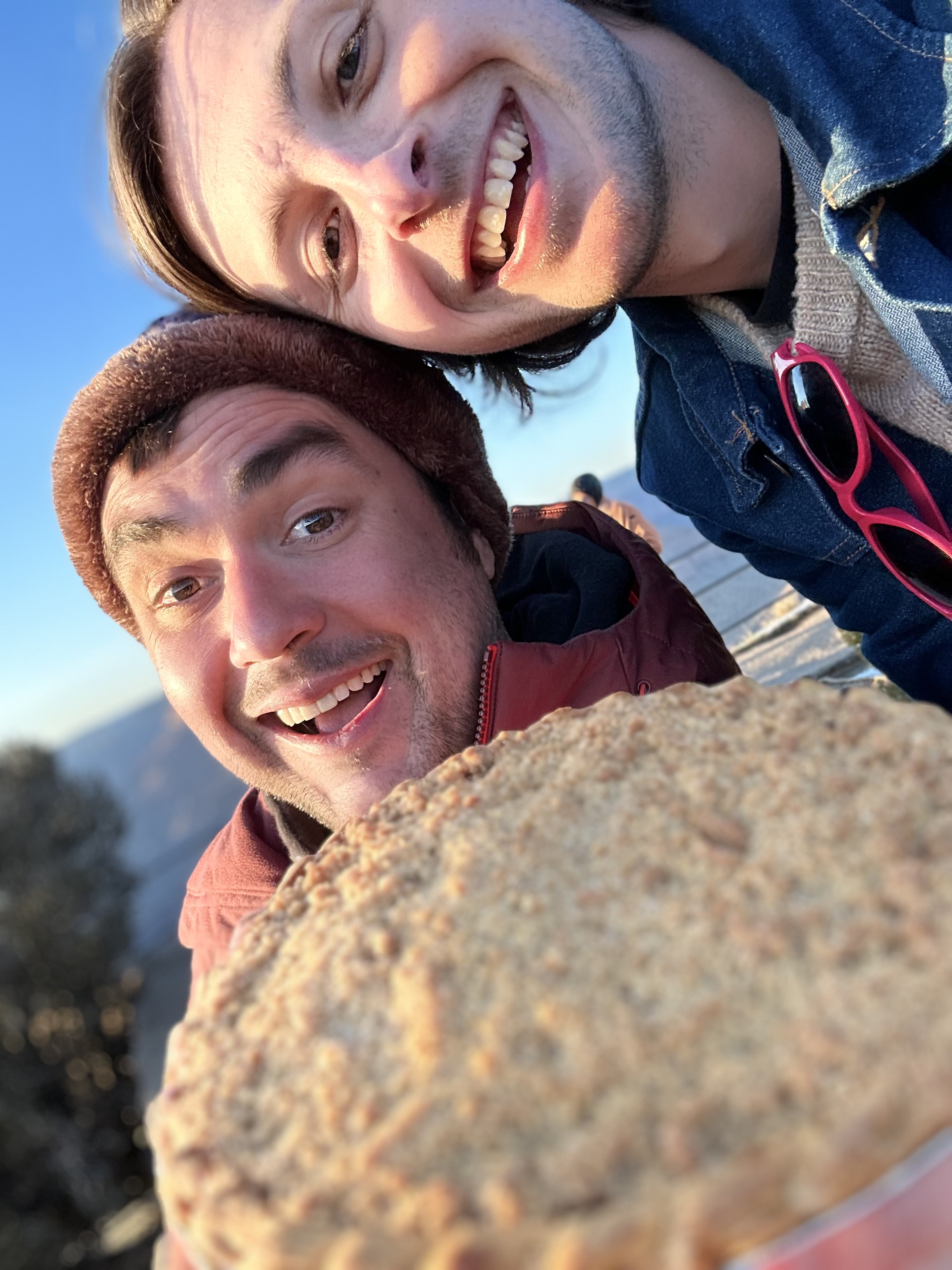 In spring 2023, Max and Asher took a vacation to the Grand Canyon. At sunset on the rim, Asher got on one knee and presented Max with, you guessed it, a pie (the circle shape is what matters). Max said yes, more crying happened than typical when eating pie, and assembled sightseers were confused and concerned.